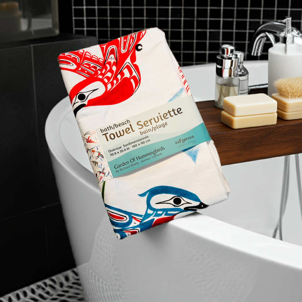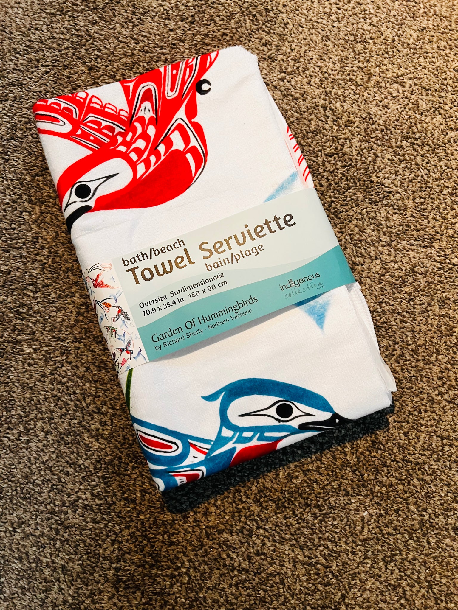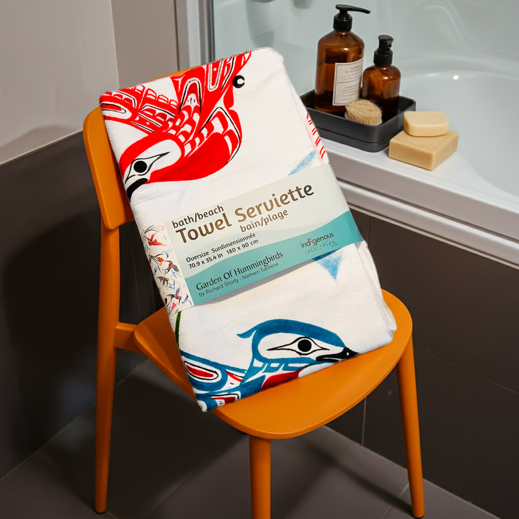 Introducing our luxurious Bath Towels - Garden of Hummingbirds. Measuring 70.9"x35.4", these indigenous designed towels are crafted from 100% polyester micro fibre for an ultra-soft and absorbent experience. Perfect for both bath and beach, this huge towel makes an excellent gift and adds a touch of elegance to any bathroom. Treat yourself to the oversized comfort of our Bath Towels.