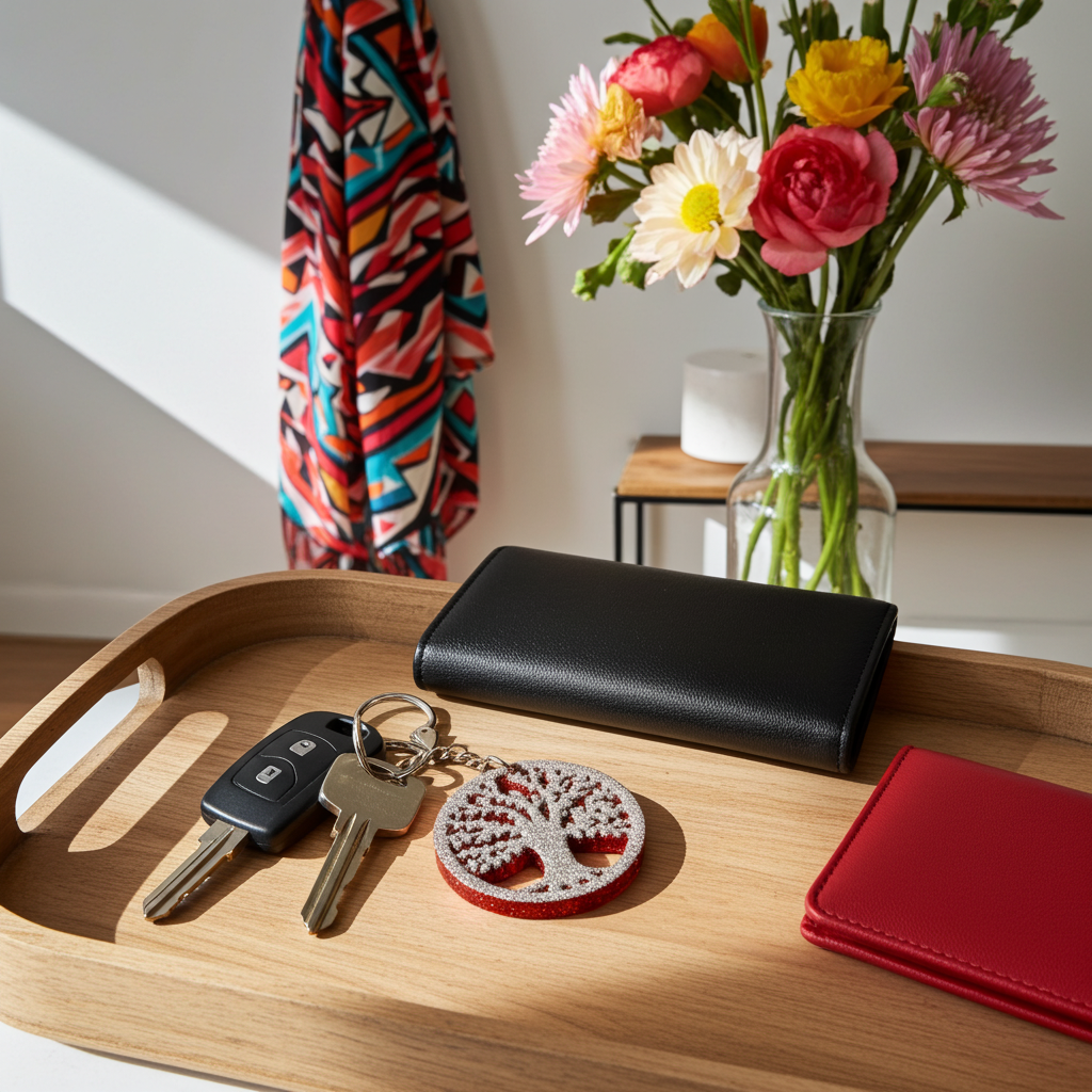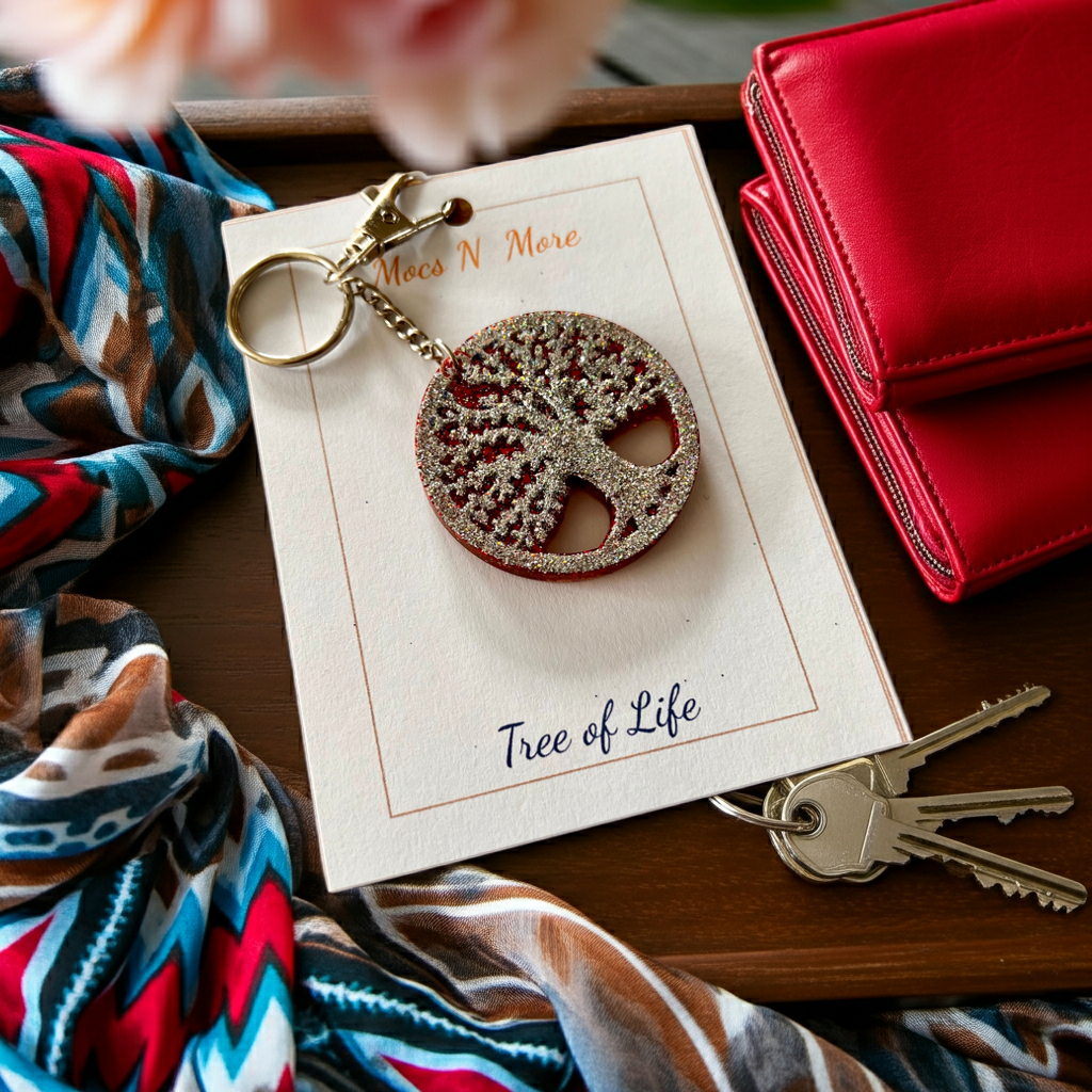 Carry a piece of artistry wherever you go. This handcrafted Tree of Life keychain features vibrant red resin swirled with shimmering silver sparkles, custom-made with premium epoxy resin for lasting durability