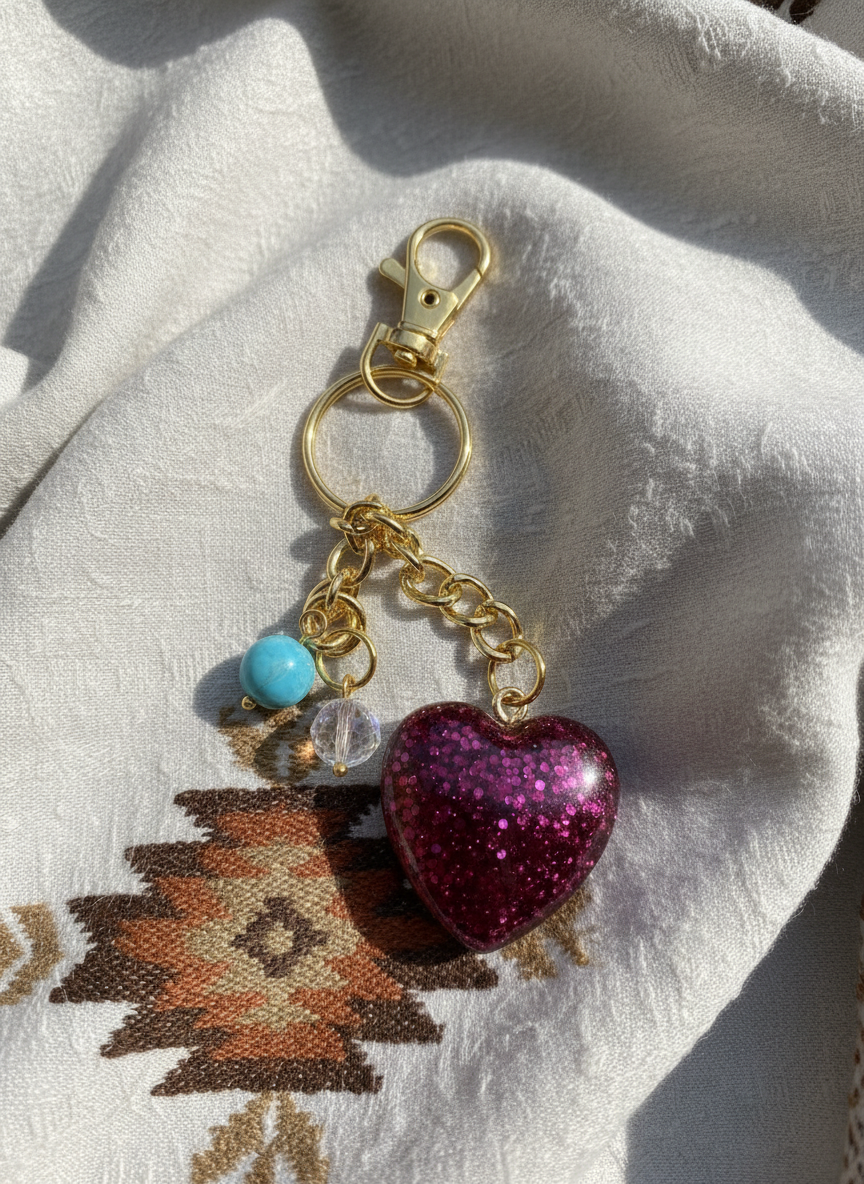 Add a touch of elegance to your everyday essentials. This stunning violet heart keychain features premium epoxy resin with mesmerizing purple sparkles, complete with a coordinating tassel for added charm.