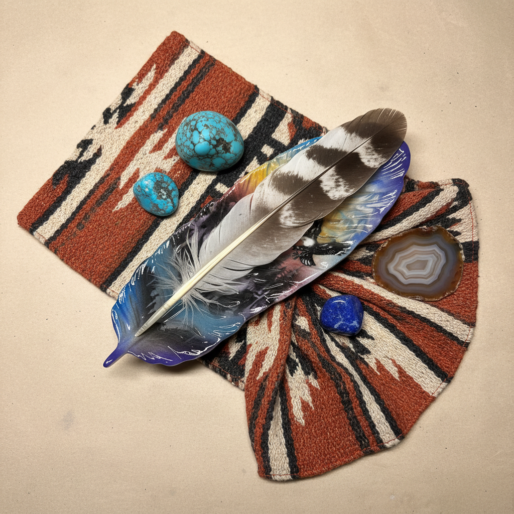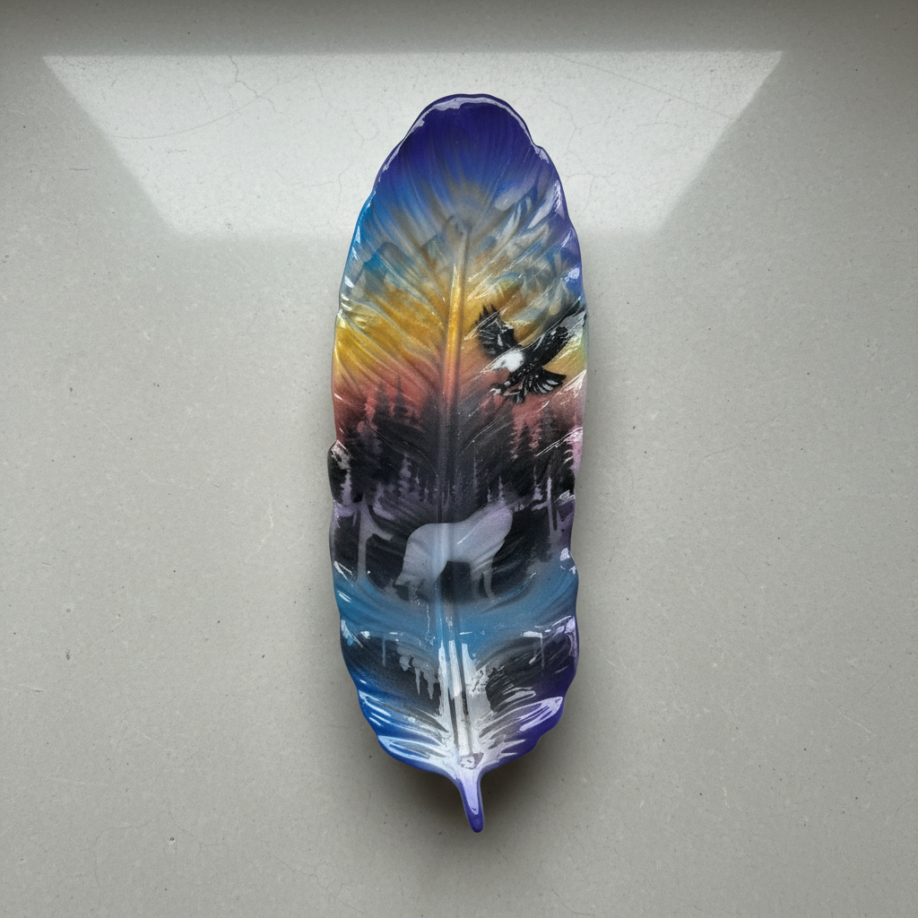 Discover the refined beauty of indigenous artistry with our hand-painted and hand-poured Feather Tray, expertly crafted by White Bear Cree artists at Mocs N More. This distinctive piece showcases a stunning nature scene featuring a majestic wolf and soaring eagle set against a backdrop of forest and mountains, all rendered in beautiful blues and yellows with touches of pink and red. The eco resin material creates a ceramic-like texture that enhances the artwork's depth and detail.
