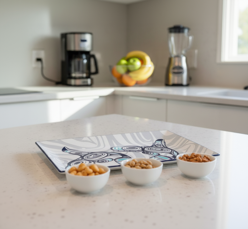 Elevate your dining experience with our Platter - Whales. Adorned with stunning Indigenous designs, these microwave and dishwasher safe platters harmonize perfectly with our other tableware pieces. Create a rich and elegant atmosphere with the perfect combination of aesthetics and function.
