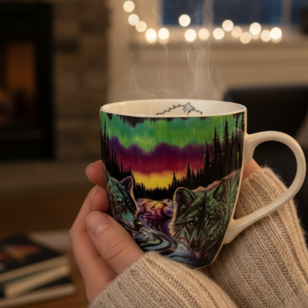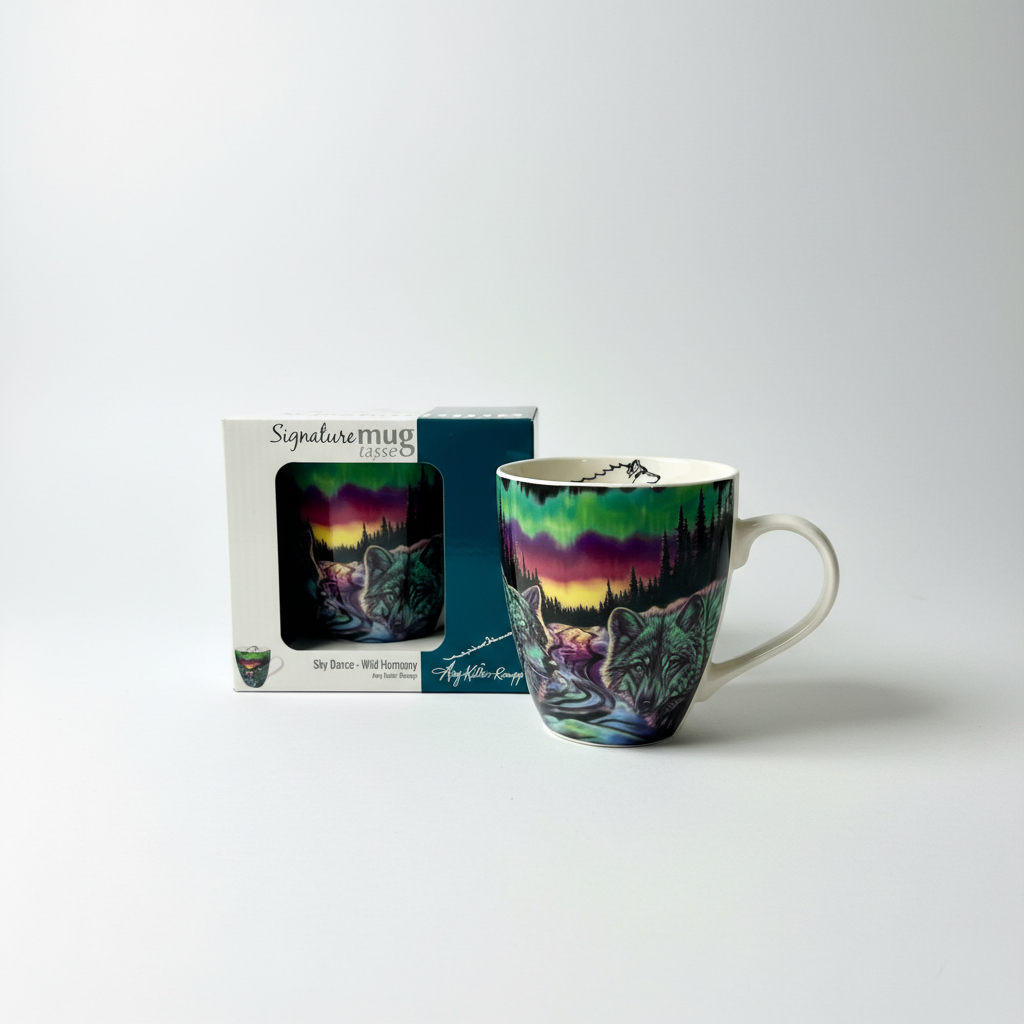 Introducing our exquisite 18 oz Signature Mugs — Sky Dance - Wild Harmony by Amy Keller-Rempp. Crafted with fine China, this mug showcases an authentic Indigenous design, while supporting the artist with a royalty. Microwave and dishwasher safe, designed in Canada, each mug comes in a gift box with an artist bio and signature on the back. Elevate your coffee experience with a touch of culture.