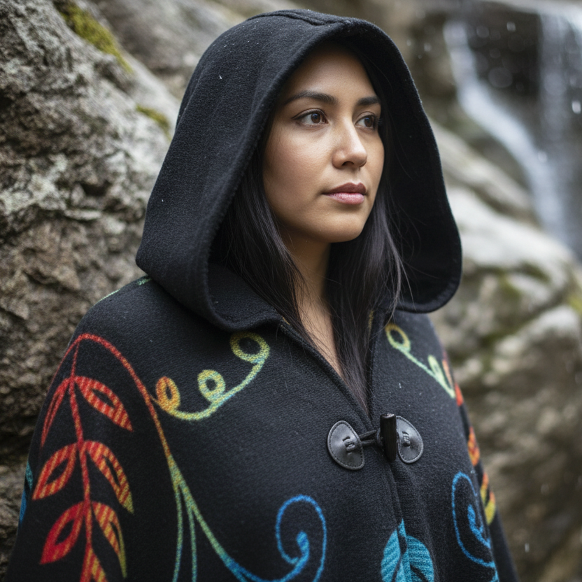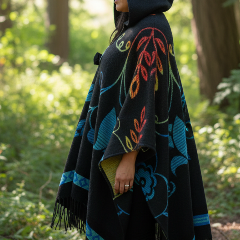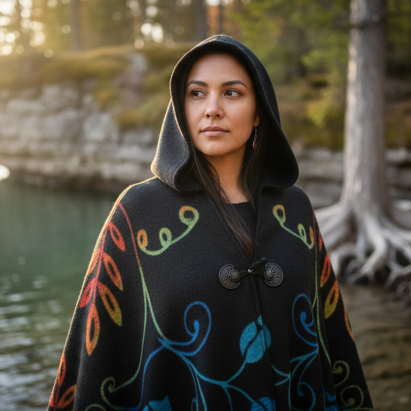 Wrap yourself in art that tells a story. Whether you're attending a special gathering, seeking comfort on a cool evening, or simply wanting to carry Indigenous design with you, this hooded wrap connects you to the land and the legacy of those who came before us.