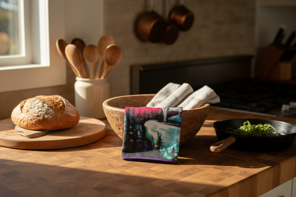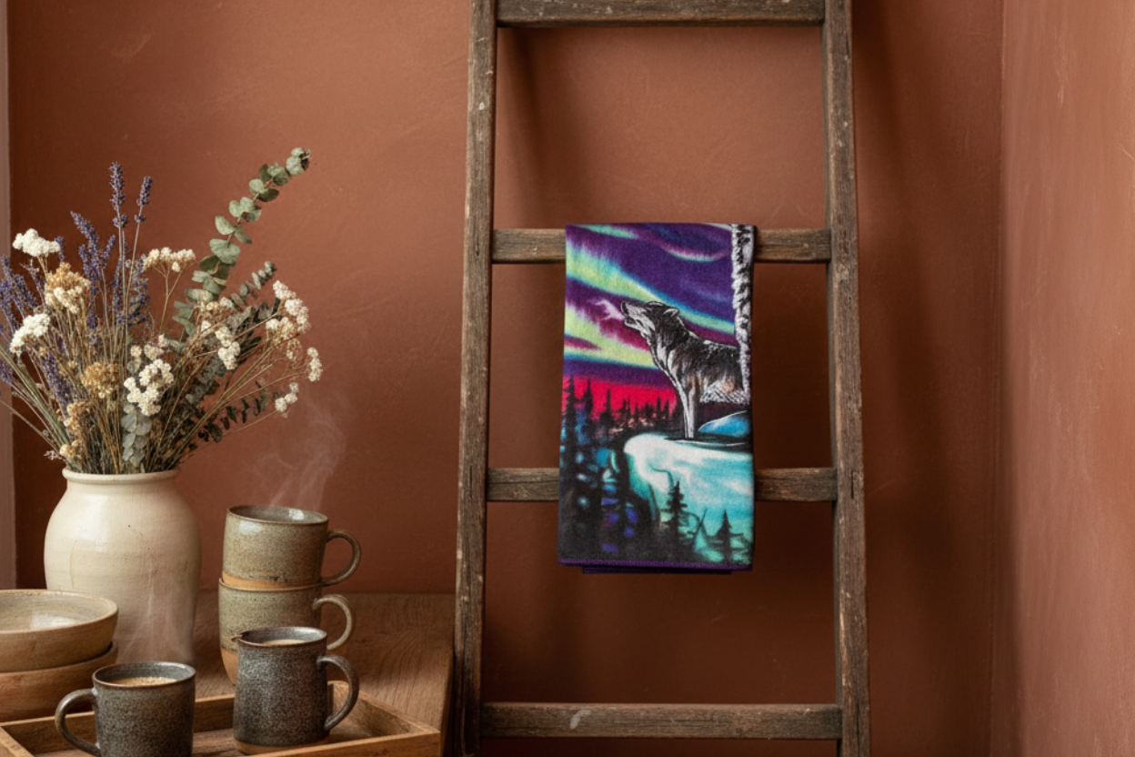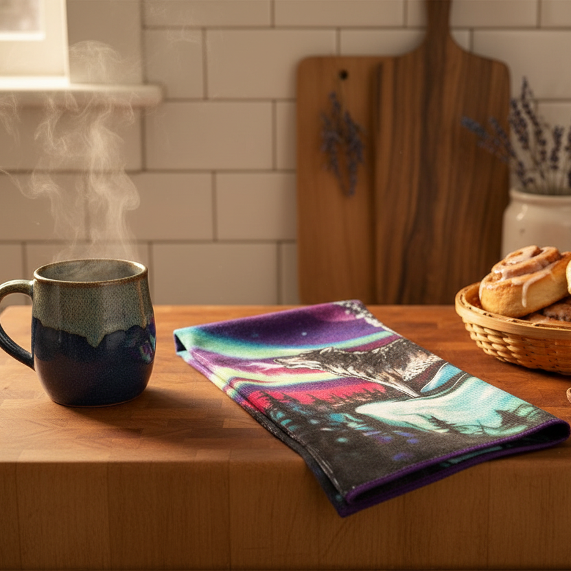 Transform your kitchen with this stunning tea towel featuring the powerful "Sky Dance Wolf Song" design by a talented Indigenous artist. This premium microfiber towel combines exceptional functionality with authentic Indigenous artistry, making it both a practical kitchen essential and a beautiful cultural statement piece.