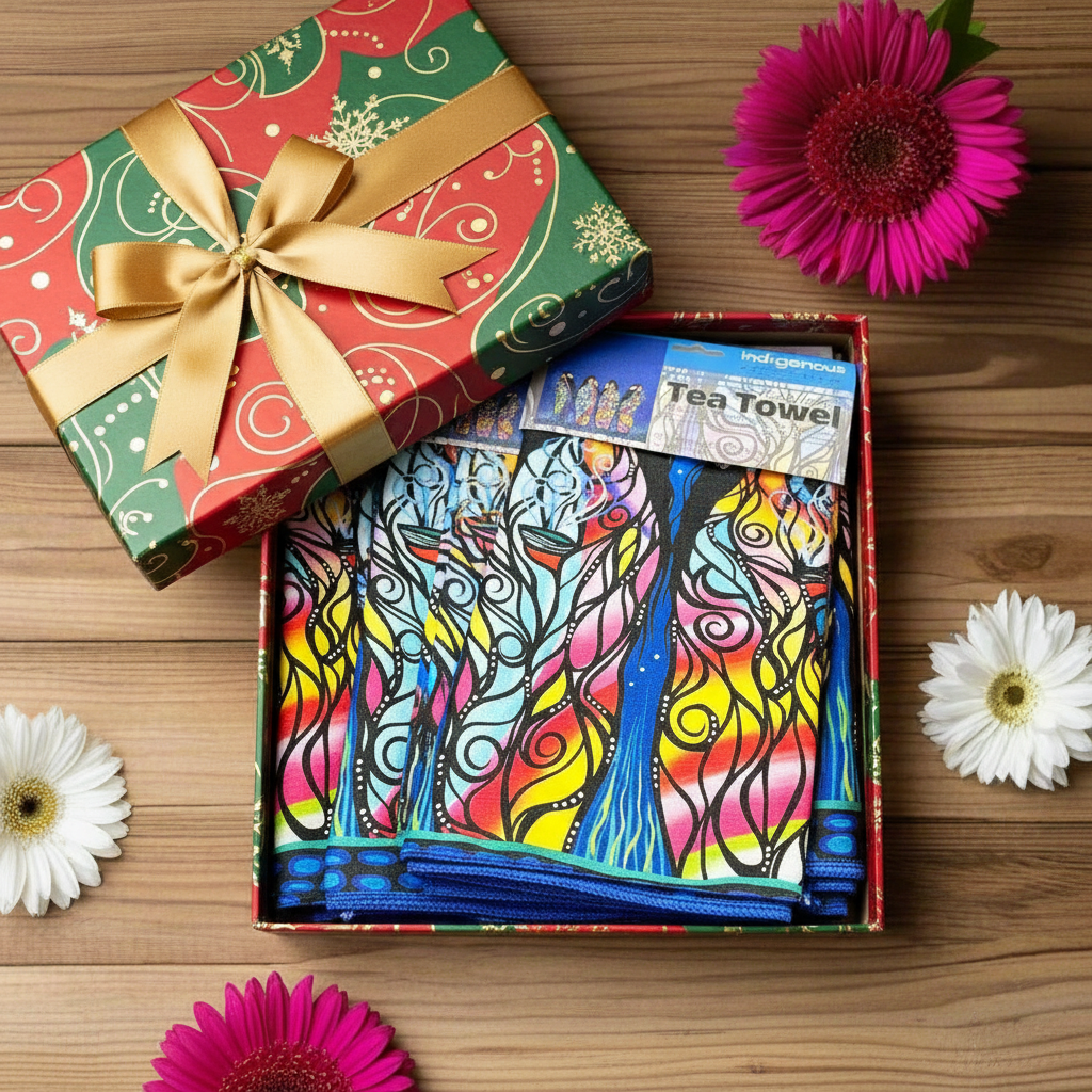 Our Tea Towels measure 19.7" x 27.5" and are crafted from high-grade microfiber material. These towels feature an Indigenous-inspired Designs
