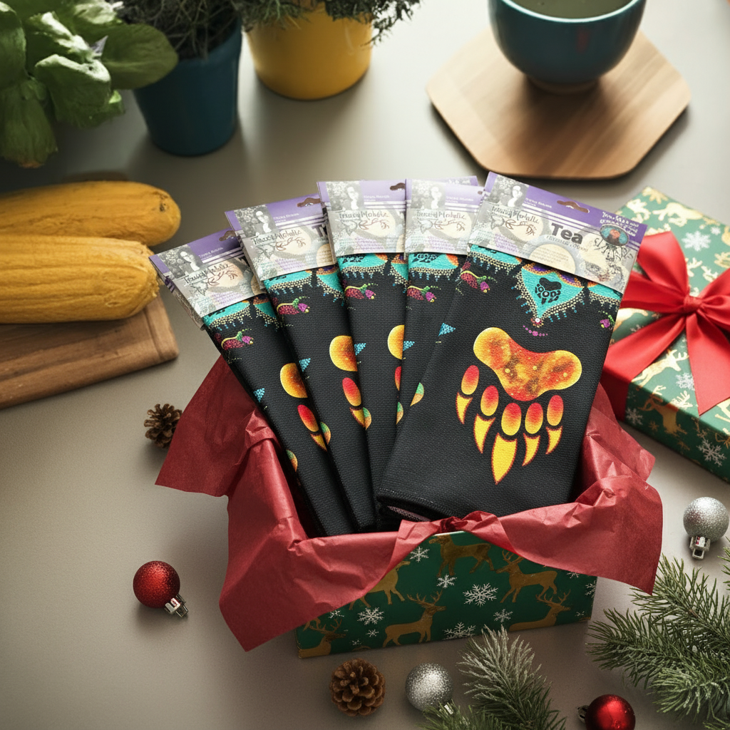Immerse yourself in the sumptuous splendor of our Revelation-inspired Tea Towels, skillfully fashioned from premium microfiber materials. Measuring 19.7" x 27.5" and embellished with elaborate motifs inspired by Indigenous cultures, these towels make an elegant addition to any household.