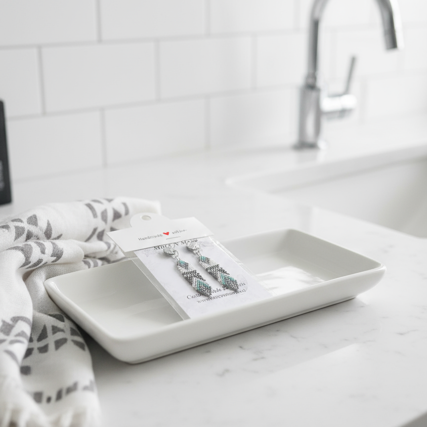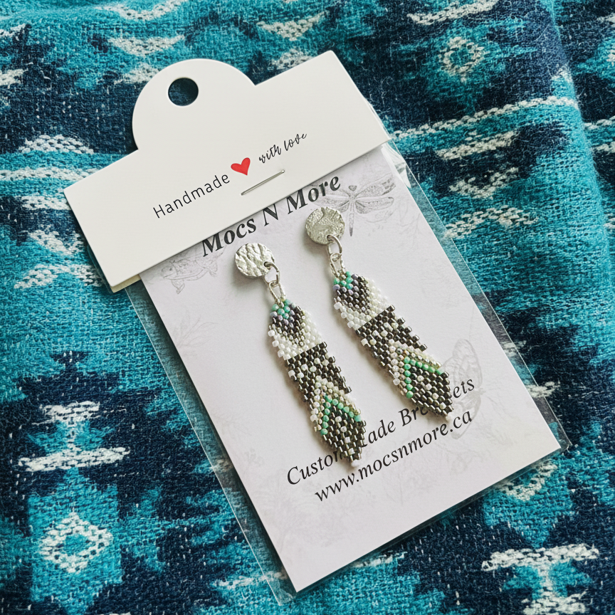 These hand-beaded earrings, exclusively made at Mocs N More, showcase an 11mm delica beaded design in White teal, metallic, black, metallic, gray, and yellow. The unique indigenous design and beautiful silver post charms make them a tasteful and elegant addition to any wardrobe. Elevate your look with these exclusive earrings.