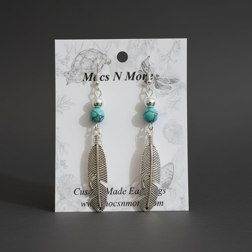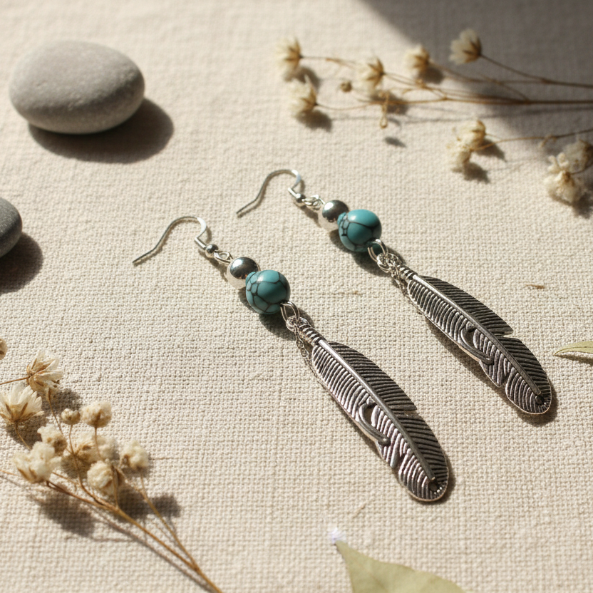 Elegant and versatile, these handcrafted Silver Feather earrings blend natural stone beauty with meaningful symbolism. The striking blue howlite beads are complemented by lustrous silver hematite accents, while the detailed feather charm adds movement and grace.