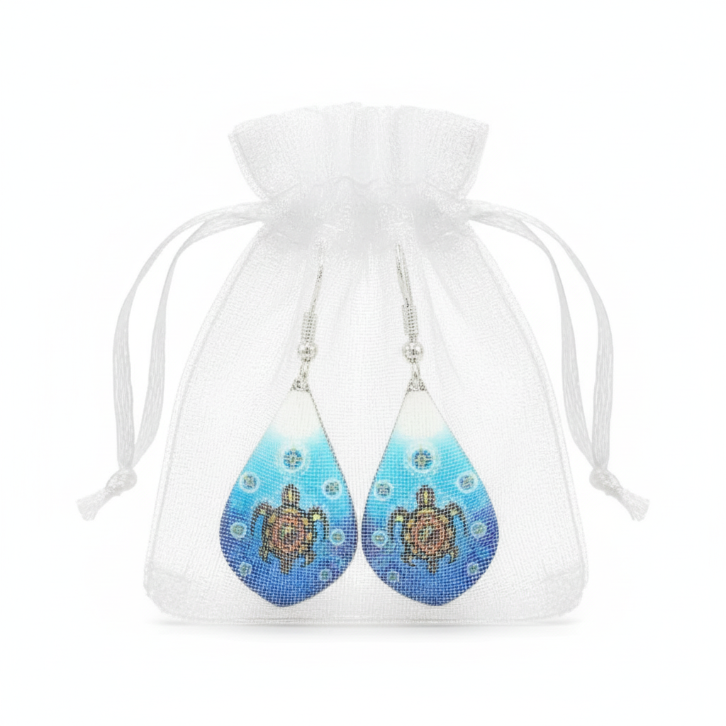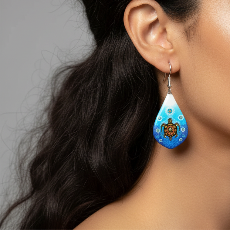 Celebrate the sacred Turtle with these stunning earrings by Odawa-Pottawatomi artist James Jacko. Each piece features the four medicine wheel colours and seven circles—one for each teaching—with birds carrying messages from the creator. Thoughtfully crafted from hypoallergenic, nickel-free zinc alloy, these dangles measure 3 cm long by 1.8 cm wide, making them a bold yet wearable statement of Indigenous artistry and spiritual meaning.