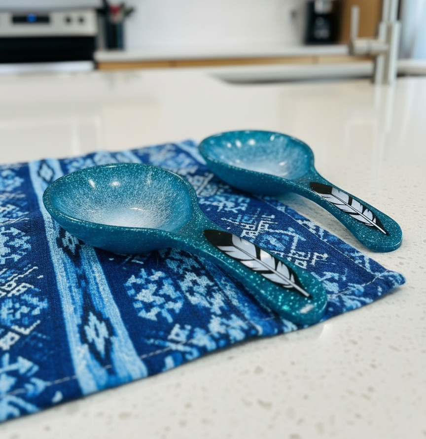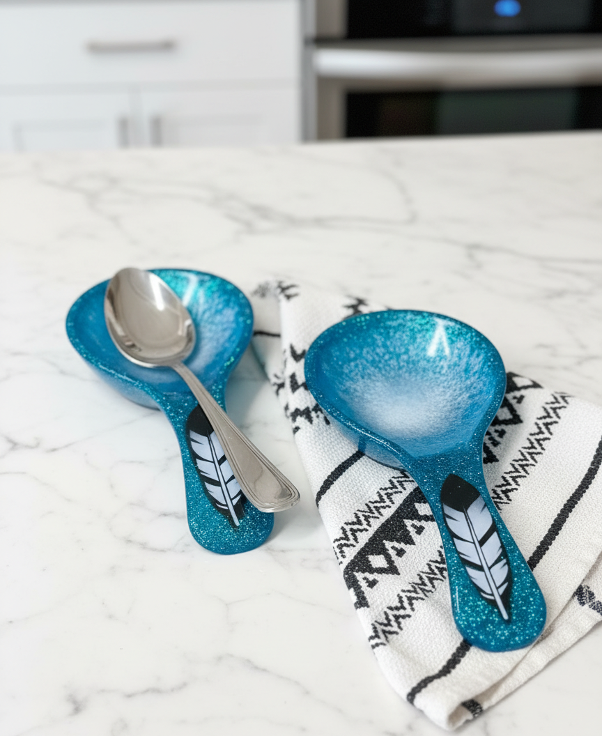 This handcrafted spoon rest brings a touch of Indigenous artistry to your kitchen counter. Each piece features a shimmering turquoise and pearl finish with a hand-painted eagle feather design—no two are exactly alike. Meticulously crafted with vibrant metallic accents and genuine sparkle, it's as much a conversation starter as it is a practical kitchen companion. Perfect for adding personality to your cooking space while honoring authentic cultural craftsmanship.