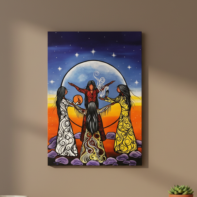 Transform your space with this powerful Full Moon Ceremony of the Four Nations wall plaque, featuring profound Indigenous art by renowned Anishinaabe artist Jackie Traverse. This beautiful design celebrates the sacred gathering of the Four Nations under the full moon, honoring unity, ceremony, and the spiritual connection that binds Indigenous peoples together.