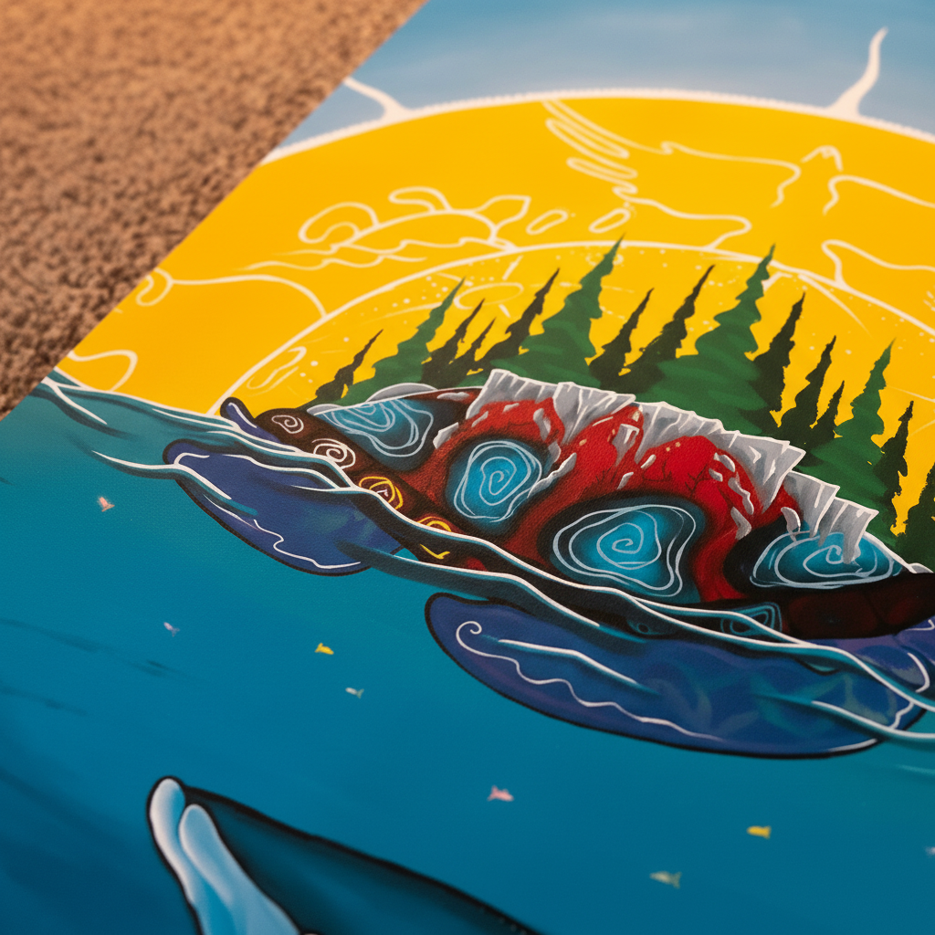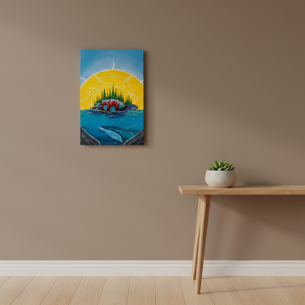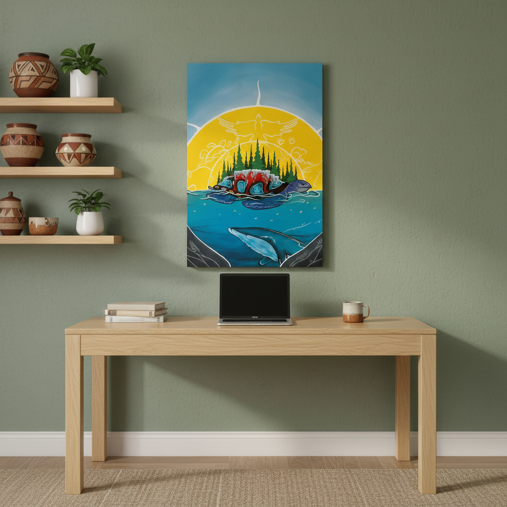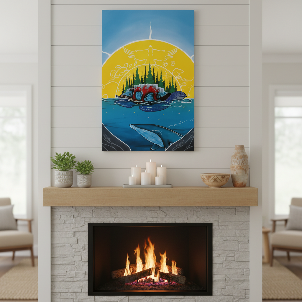 Constructed with a durable MDF shell and lightweight foam interior for easy hanging. The 12" x 18" size with 1" thickness creates a striking statement piece with a sleek black edge that beautifully frames the artwork. Features the artist's biography on the back, honoring authentic Canadian Indigenous artistry. Perfect for living rooms, offices, or sacred spaces.