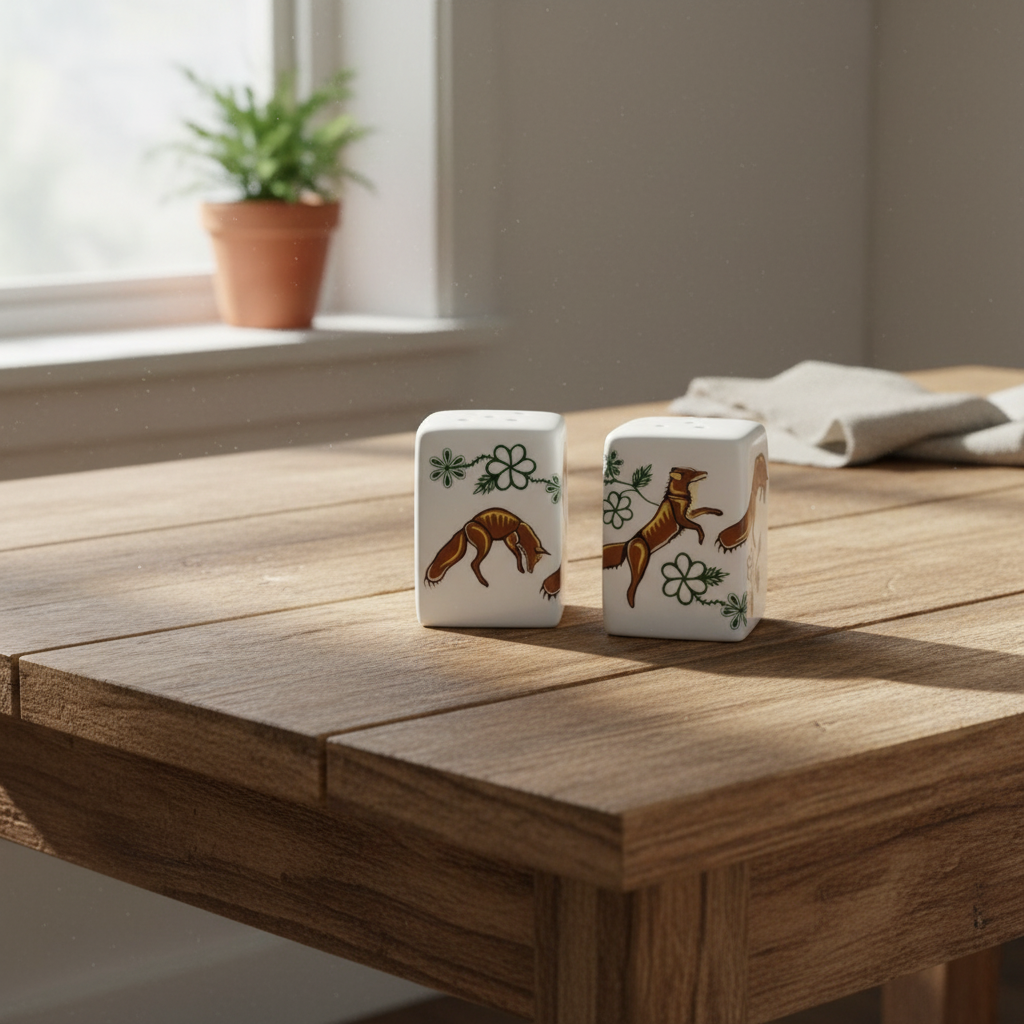 This elegant ceramic Salt and Pepper Shaker Set features the Foxes (Wagooshna) design by artist Storm Angeconeb, Lac Seul First Nation, Ojibwe.