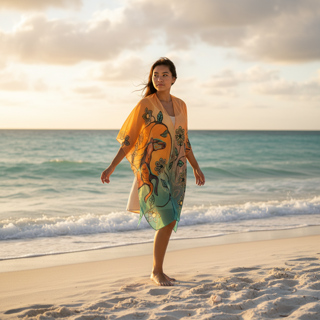Made with soft, silky sheer fabric for ultimate comfort and flow. One-size-fits-all design for seamless sophistication. Printed in Canada with artist royalties paid directly to Storm Angeconeb, ensuring you're supporting Indigenous artists and their communities with every purchase.