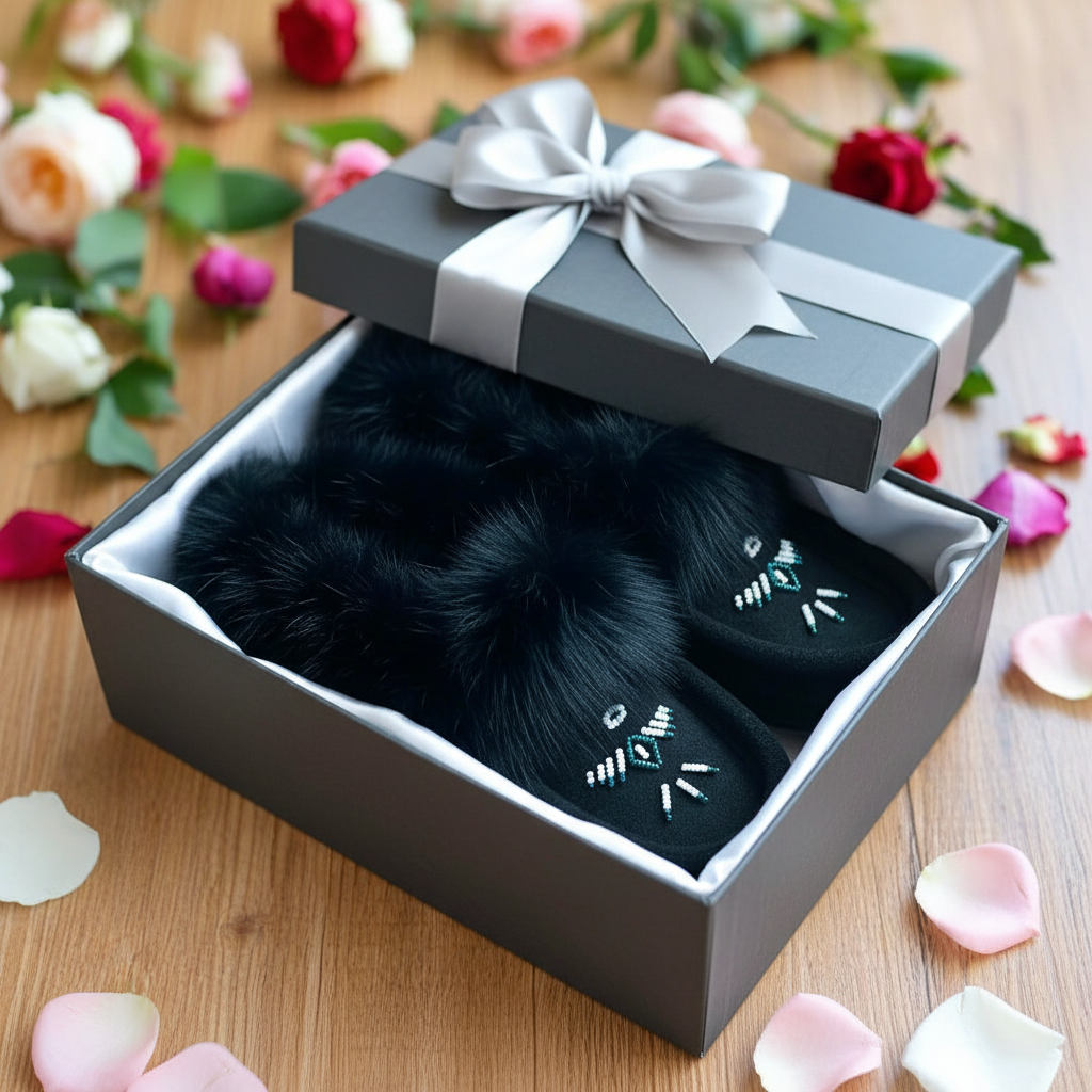 Indulge in luxurious comfort and unique style with Laurentian Chief's Ladies Moccasins in Black. These traditional slipper moccasins feature a cozy rabbit fur trim and fleece lining for maximum warmth and comfort. Adorned with a hand-beaded Thunderbird design, these moccasins are a timeless favorite among stylish women.