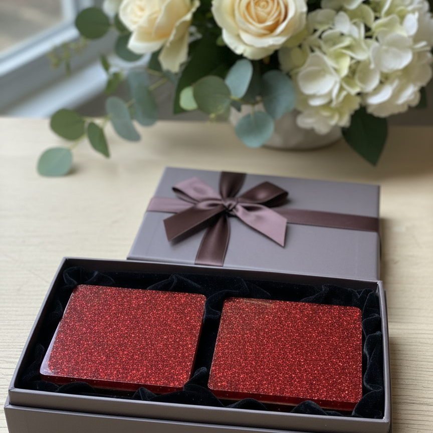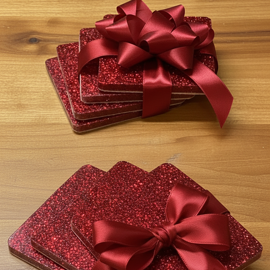 Bring the sparkle home with this set of four handcrafted coasters, each measuring 4"x4" and bursting with radiant red epoxy resin magic. Cork-backed to keep your tables safe and sound, these custom-made treasures are created with care right here at Mocs n More. They're the perfect way to add a dash of dazzle to your daily routine—and they make fantastic gifts for anyone who loves a little extra shine in their life.