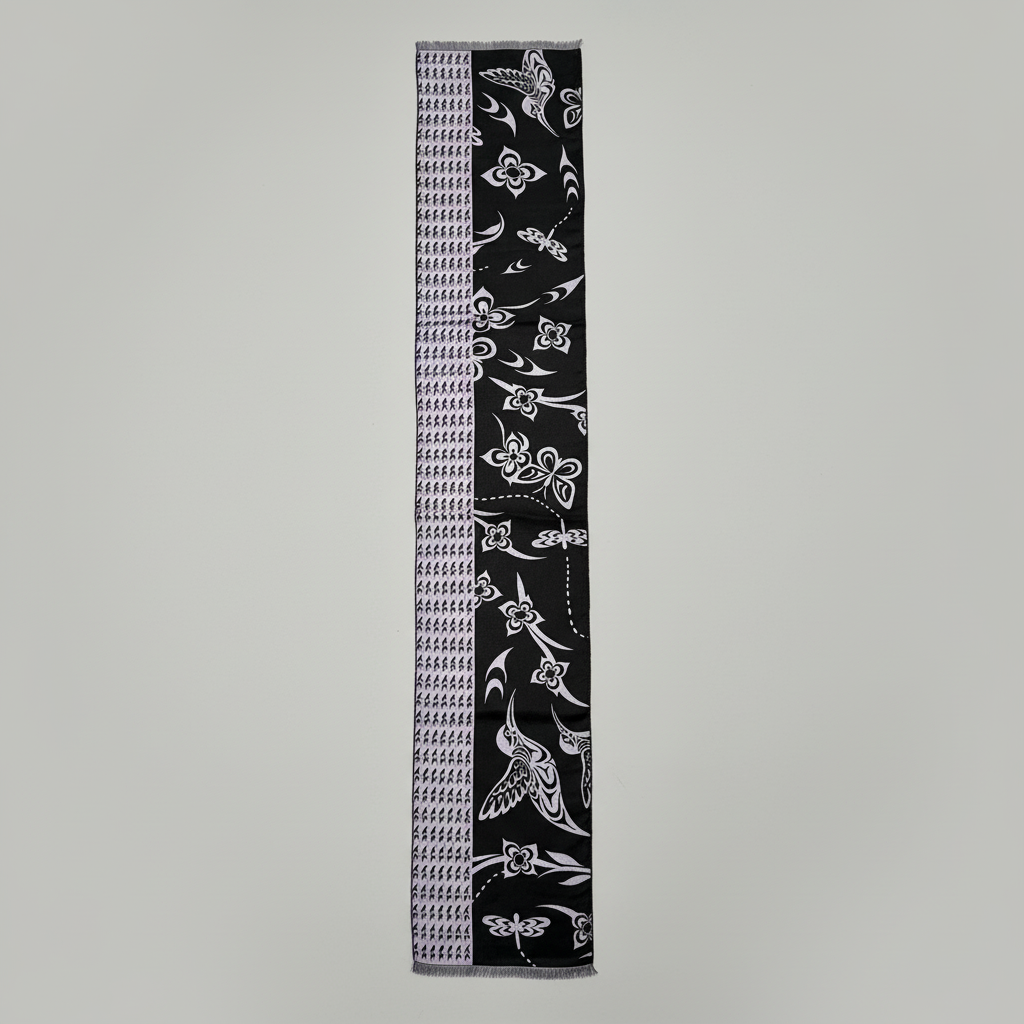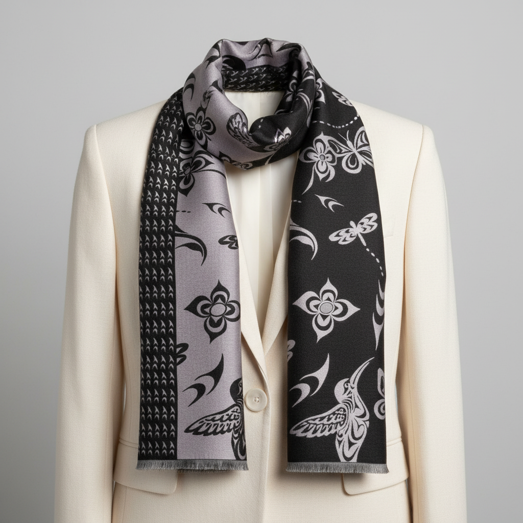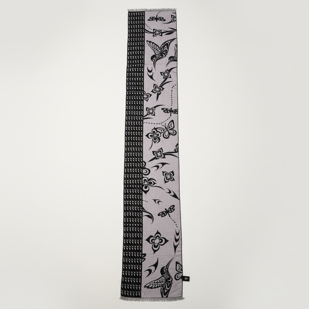 Elevate your everyday style with this luxuriously soft scarf that feels like a gentle embrace. Crafted from a sumptuous blend of 35% silk and 65% viscose, it drapes beautifully while keeping you warm and cozy. Flip it over to discover a reversible Indigenous-designed pattern on each side—two looks in one piece. Whether you're layering for warmth or adding a pop of artistry to your outfit, this scarf delivers comfort without compromise. Presented in gorgeous packaging, it's ready to gift or keep for yourself.