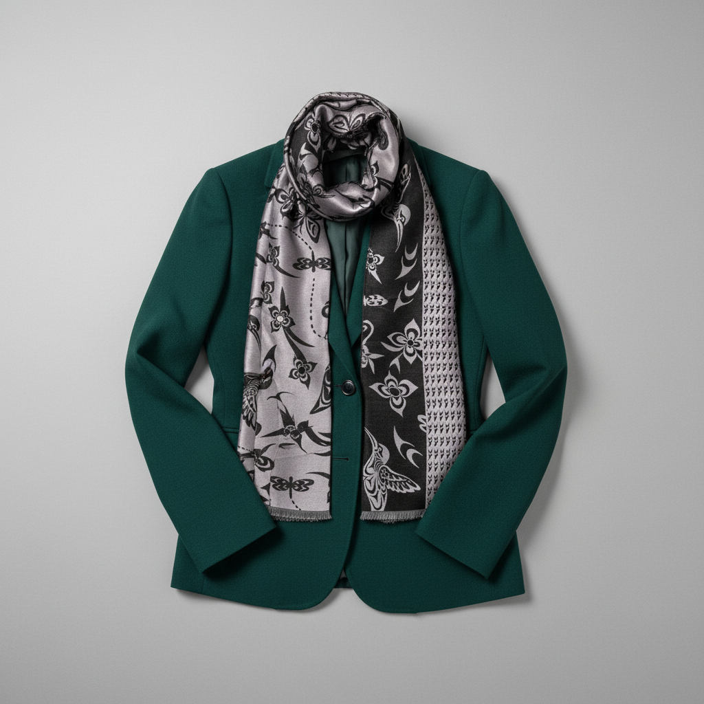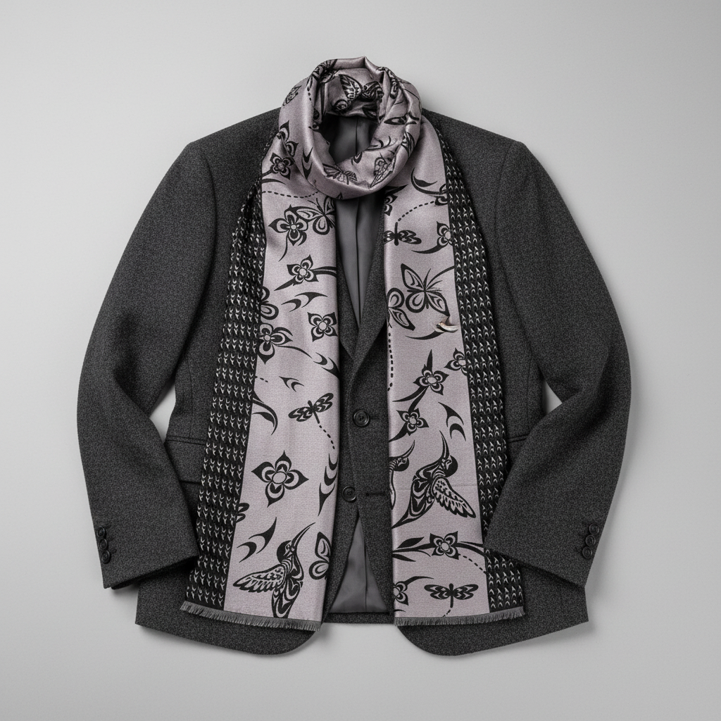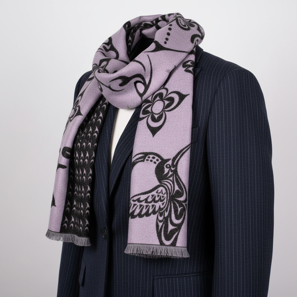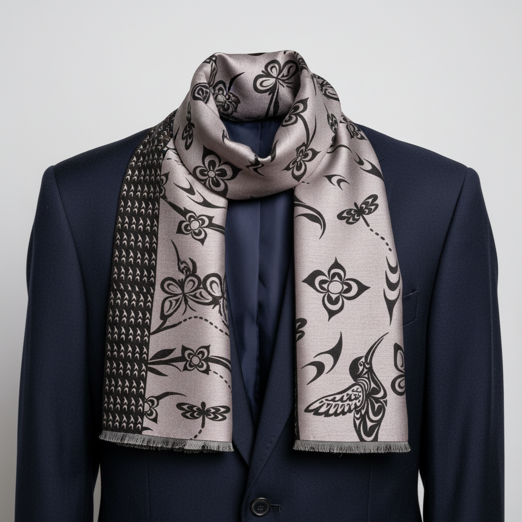 Elevate your everyday style with this luxuriously soft scarf that feels like a gentle embrace. Crafted from a sumptuous blend of 35% silk and 65% viscose, it drapes beautifully while keeping you warm and cozy. Flip it over to discover a reversible Indigenous-designed pattern on each side—two looks in one piece. Whether you're layering for warmth or adding a pop of artistry to your outfit, this scarf delivers comfort without compromise. Presented in gorgeous packaging, it's ready to gift or keep for yourself.