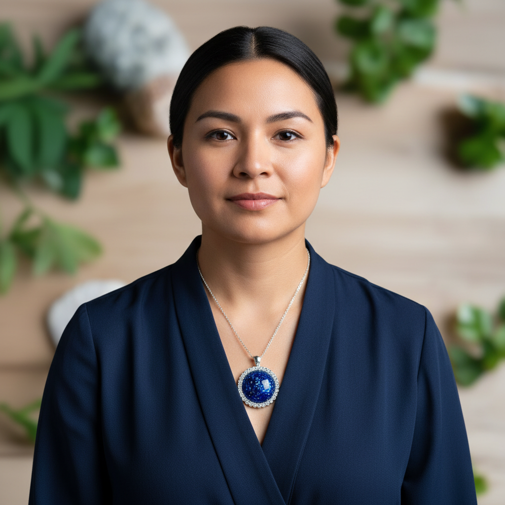 Courage Pendant on Indigenous model - navy blue blouse