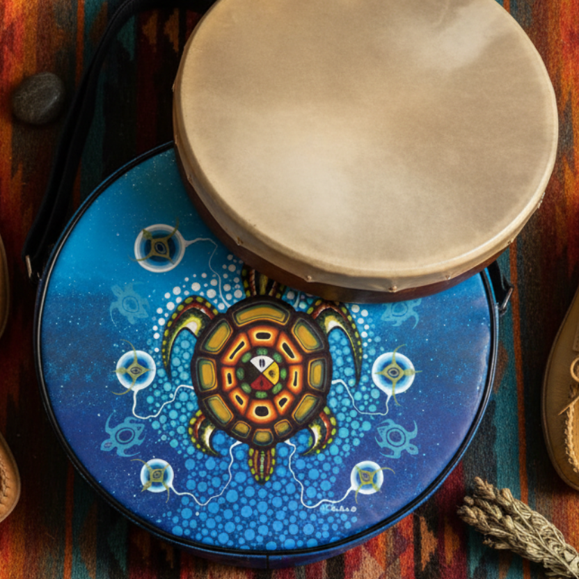 The Turtle is sacred in the indigenous culture. It carries the four colours of the medicine wheel, symbolizing important elements and can be different depending on the tribe. The seven circles represent the seven teachings of our people, and inside each circle is a bird that delivers the message of the creator..