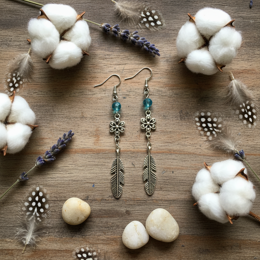 The Feather and Bloom earrings blend bohemian charm with artistic elegance. The brass feather and flower charms dance alongside vibrant glass beads, creating a statement piece that's perfect for free spirits and nature lovers alike.