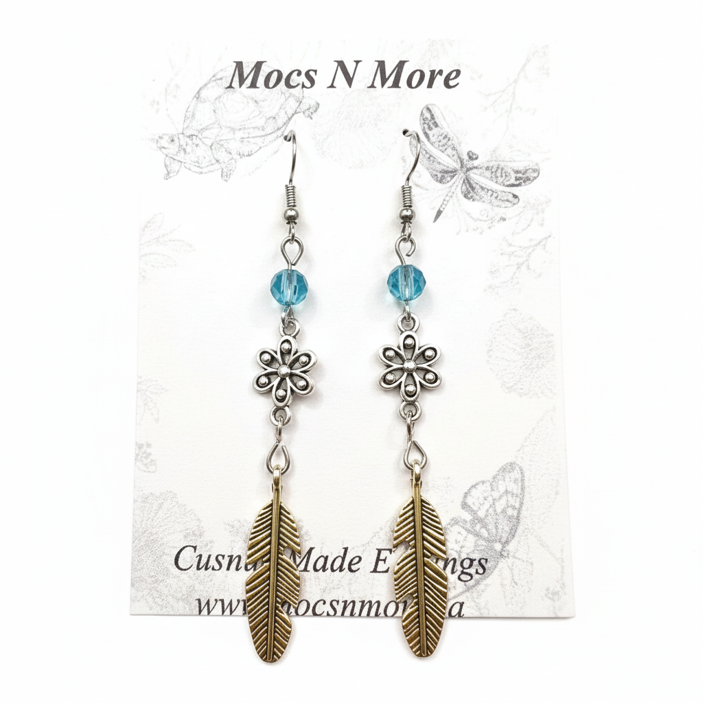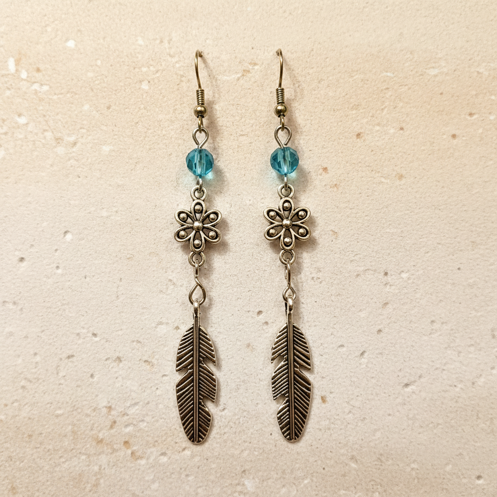 Materials: Brass feather and flower charms, glass beads, hypoallergenic posts