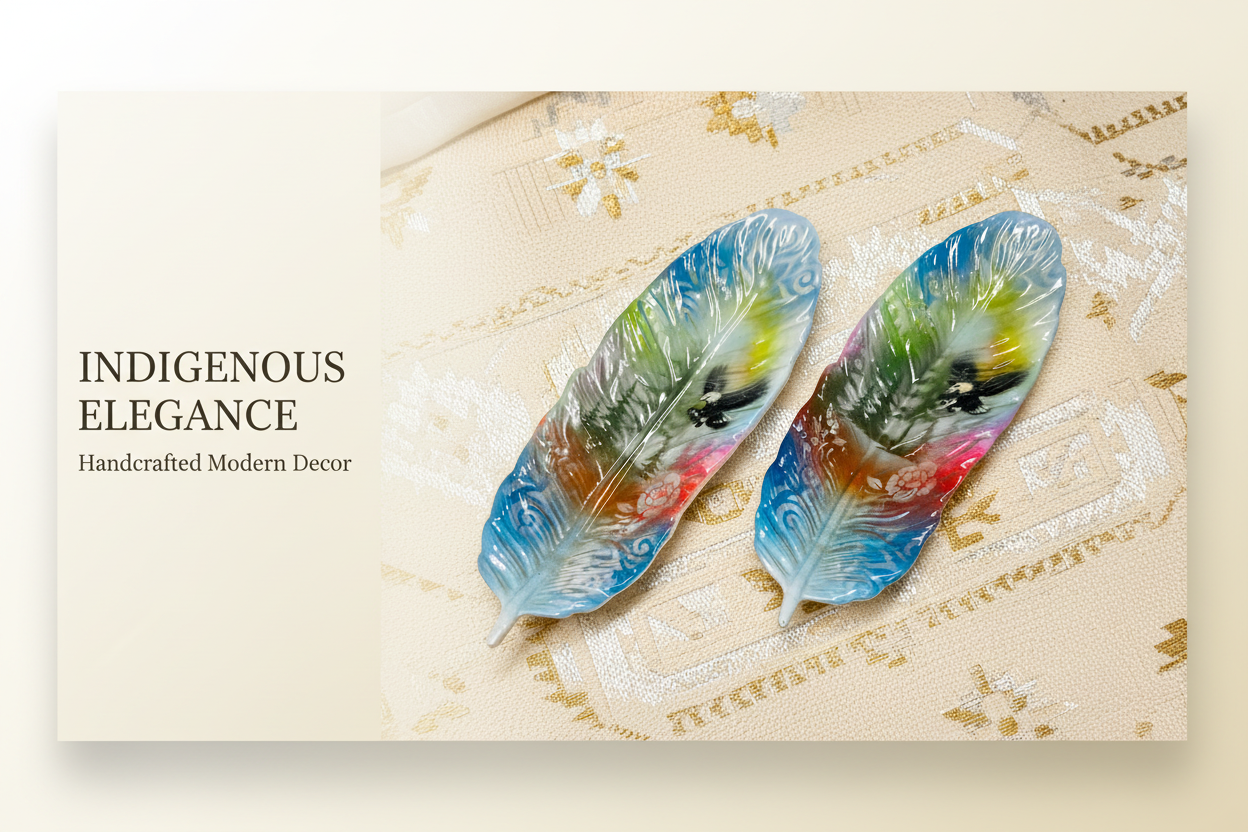 Capture the refined beauty of tribal artistry with our hand-painted Feather Tray, meticulously crafted by indigenous creators. This distinctive piece, a thoughtful gift, is carefully handmade at Mocs N More. To maintain its intricate design, hand washing is recommended. Perfectly sized at 9.5"x3.5", it adds a touch of elegance to any setting. Created by the White Bear Cree Artist, these versatile trays are ideal for holding snacks, jewelry, or serving as a striking centerpiece, each showcasing a magnificent eagle feather motif.