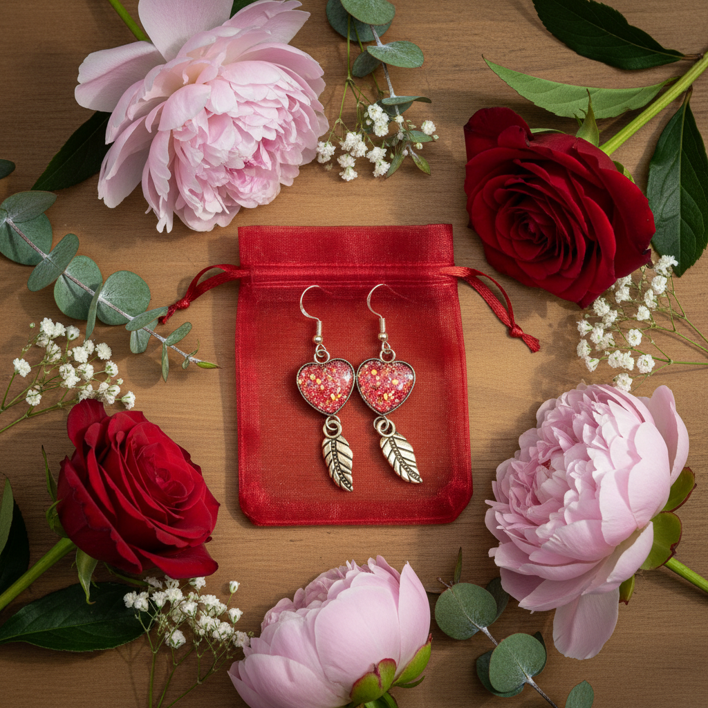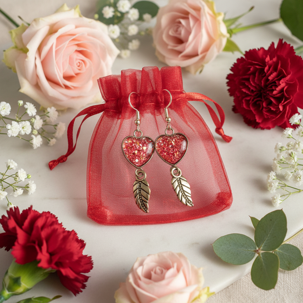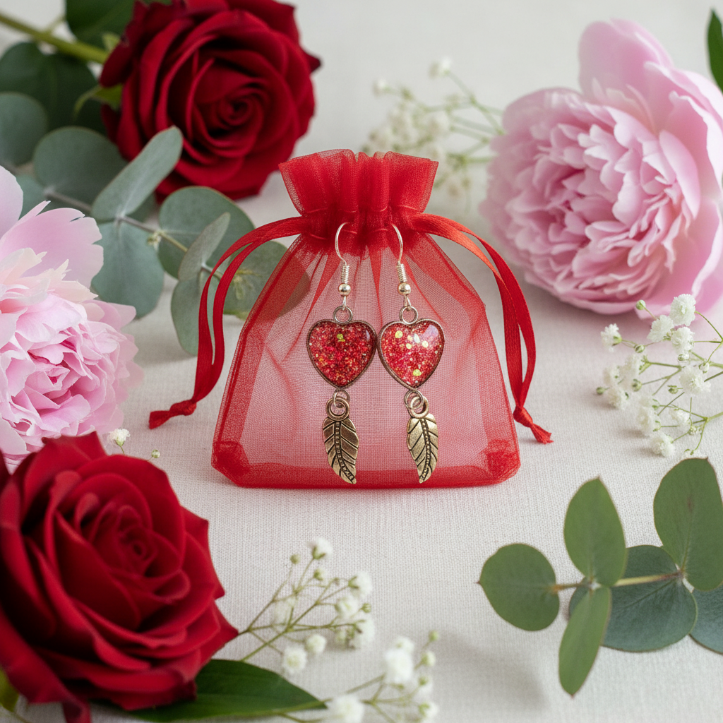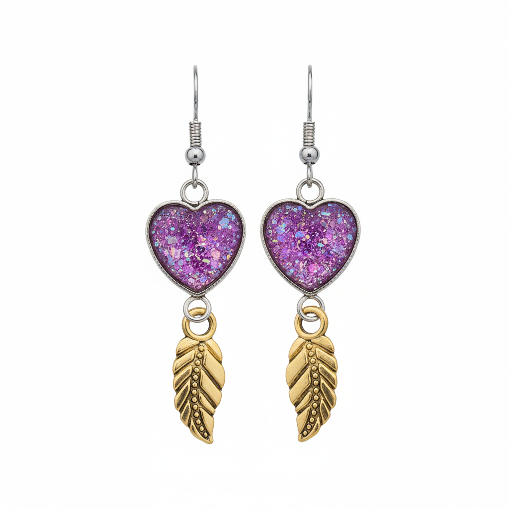 Materials: Brass heart and feather charms, sparkly resin inserts (pink, bronze, or violet), hypoallergenic posts
