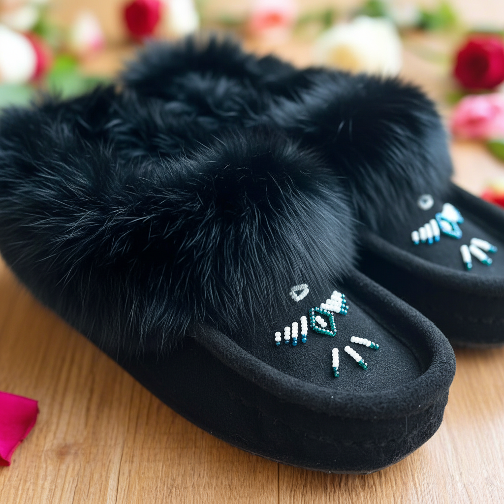 Indulge in luxurious comfort and unique style with Laurentian Chief's Ladies Moccasins in Black. These traditional slipper moccasins feature a cozy rabbit fur trim and fleece lining for maximum warmth and comfort. Adorned with a hand-beaded Thunderbird design, these moccasins are a timeless favorite among stylish women.