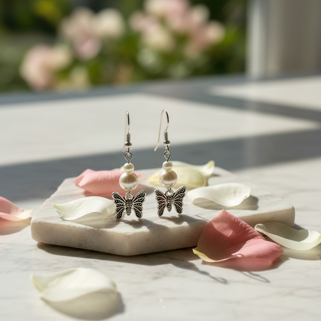 Introducing Mocs N More Earrings, handmade with real 6mm and 2mm pearl beads for an elegant touch. Hypoallergenic posts make them suitable for anyone. The beautiful butterfly charm adds a touch of transformation, symbolizing change and growth. Elevate your style with these luxurious earrings.