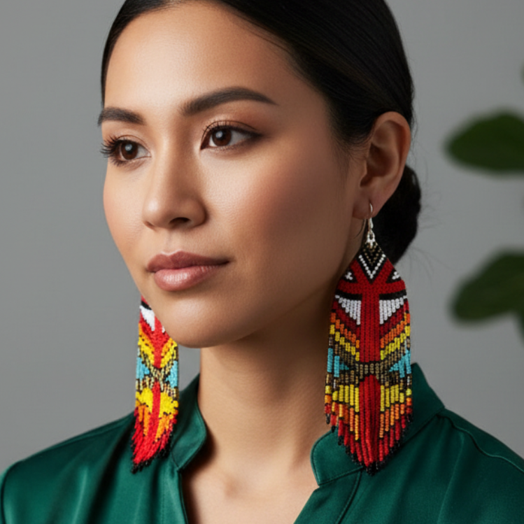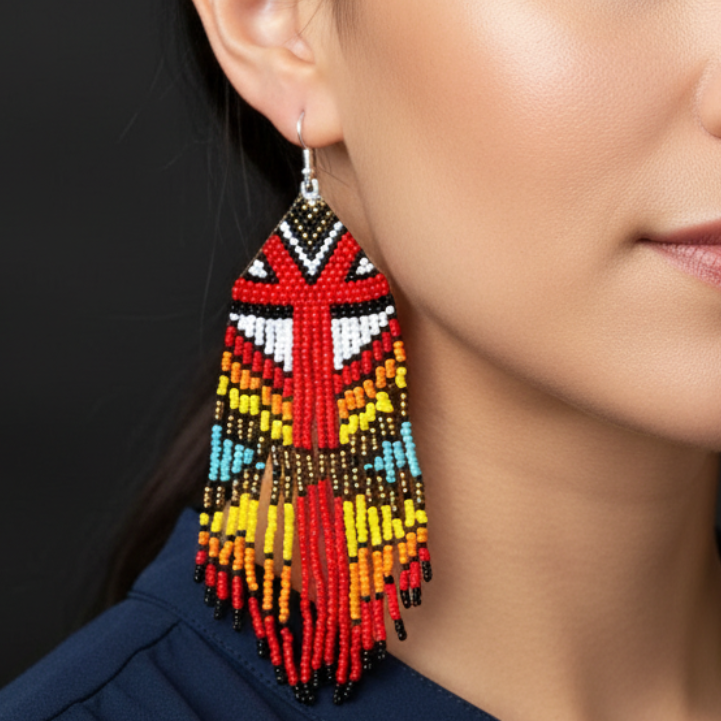 Elevate your style with these handcrafted Mocs N More Fancy Dancer earrings. Featuring a striking shawl-inspired design, the round glass beads in vibrant shades of red, black, white, orange, yellow, gold, and turquoise create a captivating palette. Measuring 5" by 1.75", these earrings are both bold and elegant. Crafted with hypoallergenic posts, they offer comfort without compromising on sophistication. A unique accessory that celebrates artistry and tradition with every detail.