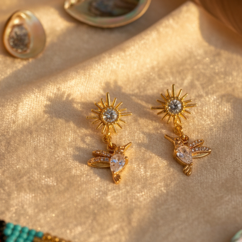 Radiate elegance with these stunning Hummingbird Sun earrings, where nature-inspired artistry meets premium craftsmanship. Each earring features a luminous sun motif paired with a delicate hummingbird charm, both beautifully adorned with sparkling cubic zirconia stones that catch the light with every movement.