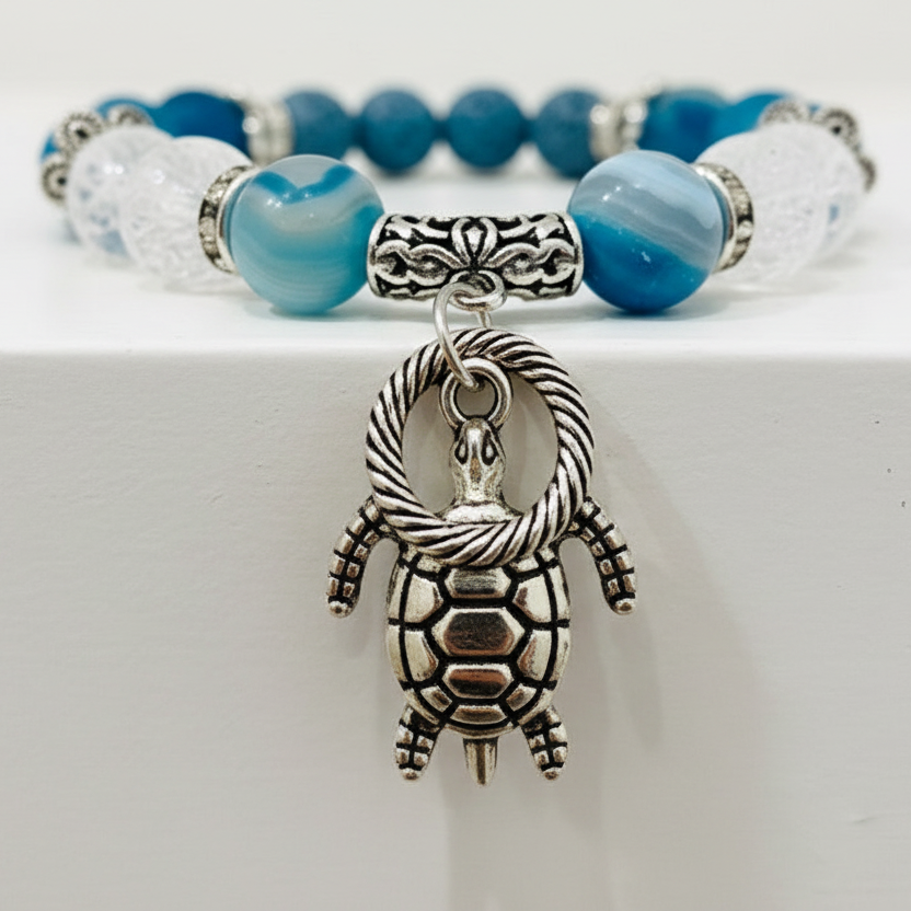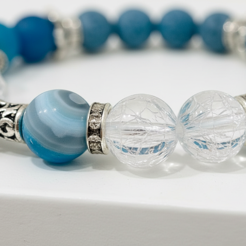 Blue Agate calms the mind while fostering clarity and open communication. Paired with cracked quartz—a symbol of transformation that amplifies intentions and activates chakras—and grounding lava stone for emotional release, this handcrafted bracelet channels spiritual intention into daily wear. Featuring 10mm semi-precious stones, delicate brass accents, and a comfortable stretch band, each piece is thoughtfully made at Mocs n More to support your wellness journey.