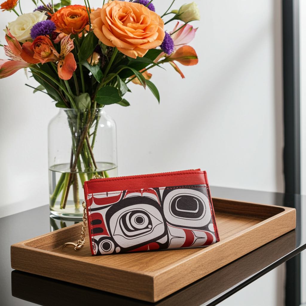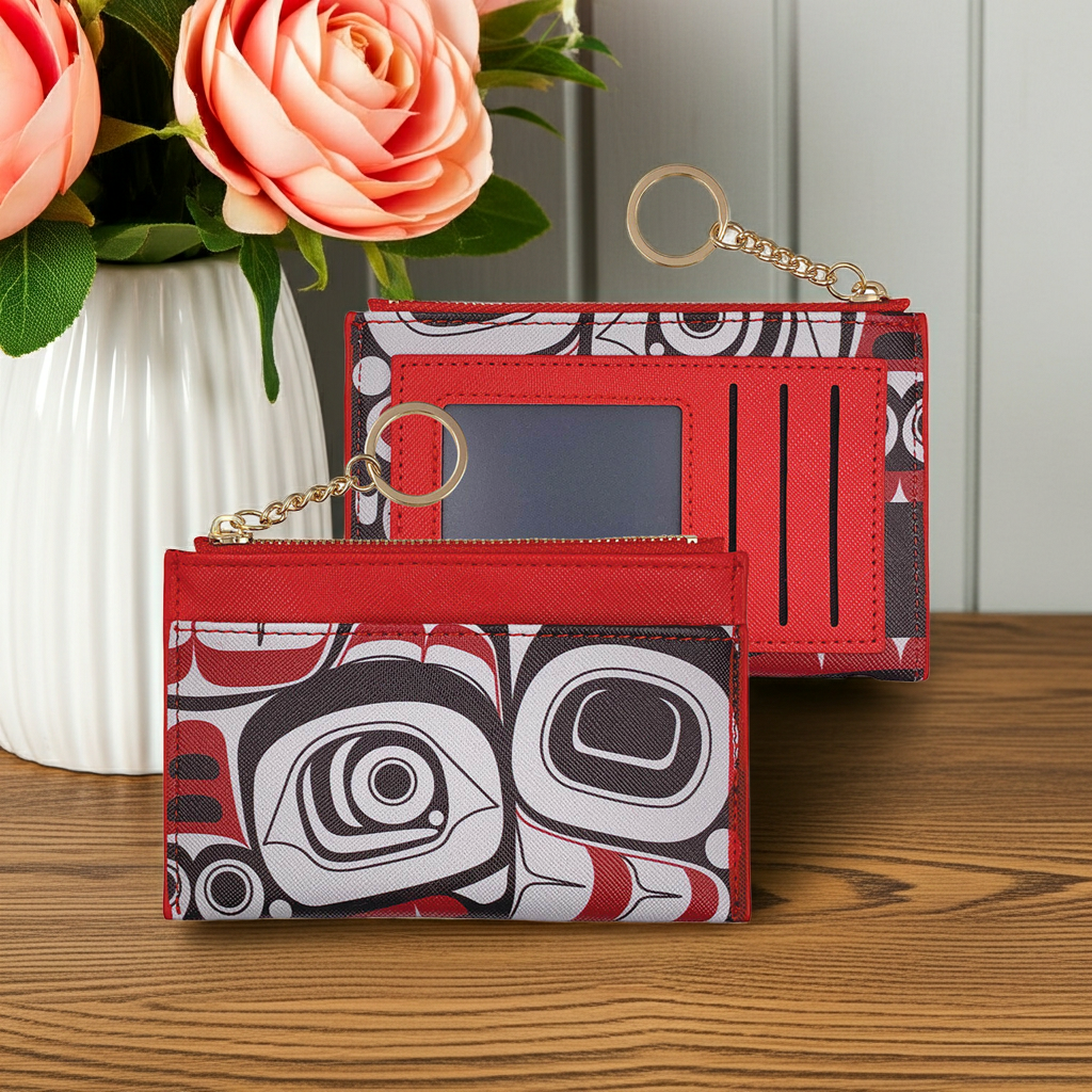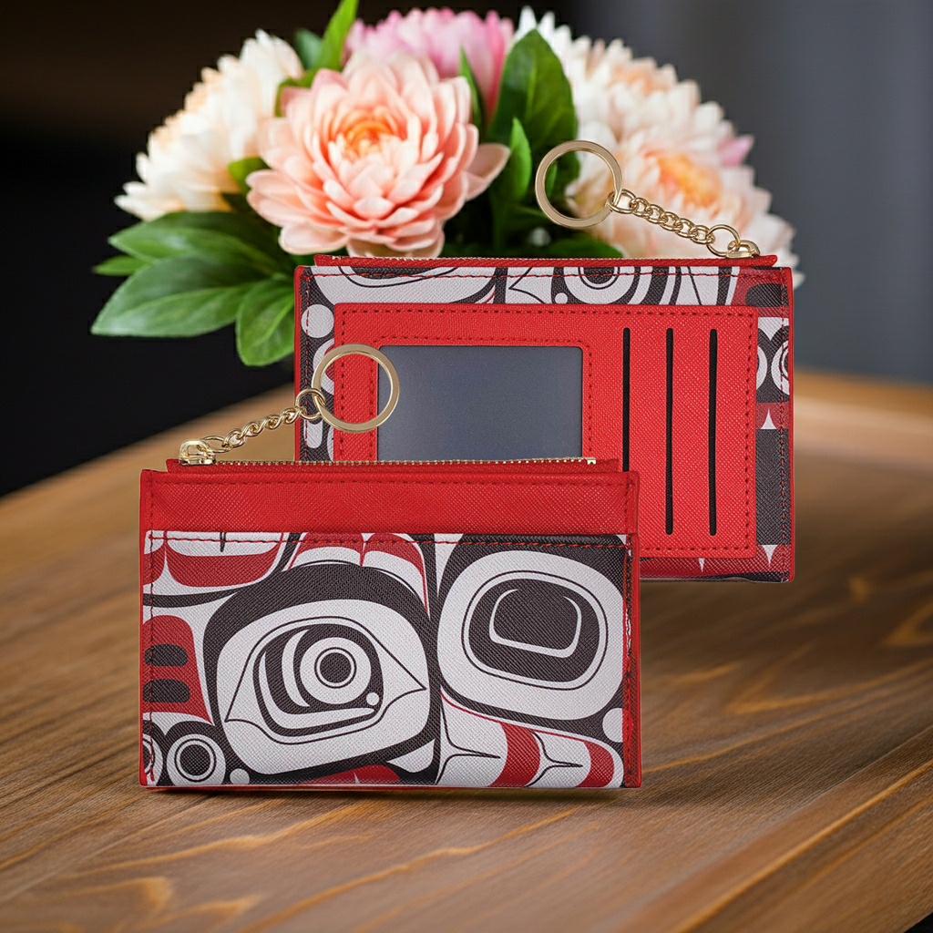 Carry your essentials with understated elegance in this compact zippered card wallet, designed with authentic Indigenous artistry at its heart. Crafted from premium vegan leather, it measures 5.325" x 3.5" and offers thoughtful organization: three dedicated card slots, a secure zippered compartment, and an open pocket for quick access. The refined design balances functionality with cultural storytelling, making it equally suited to everyday carry or as a meaningful gift that celebrates Indigenous craftsmanship.
