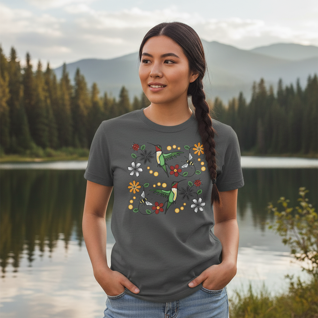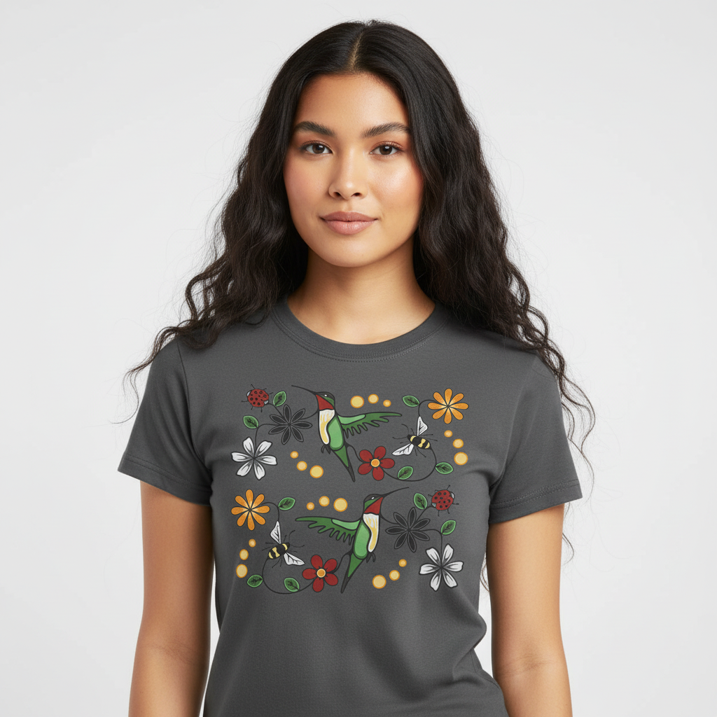 This Charcoal women's t-shirt features the Indigenous design Hummingbird (Nenookaasi) by Lac Seul First Nation, Ojibwe artist Storm Angeconeb.