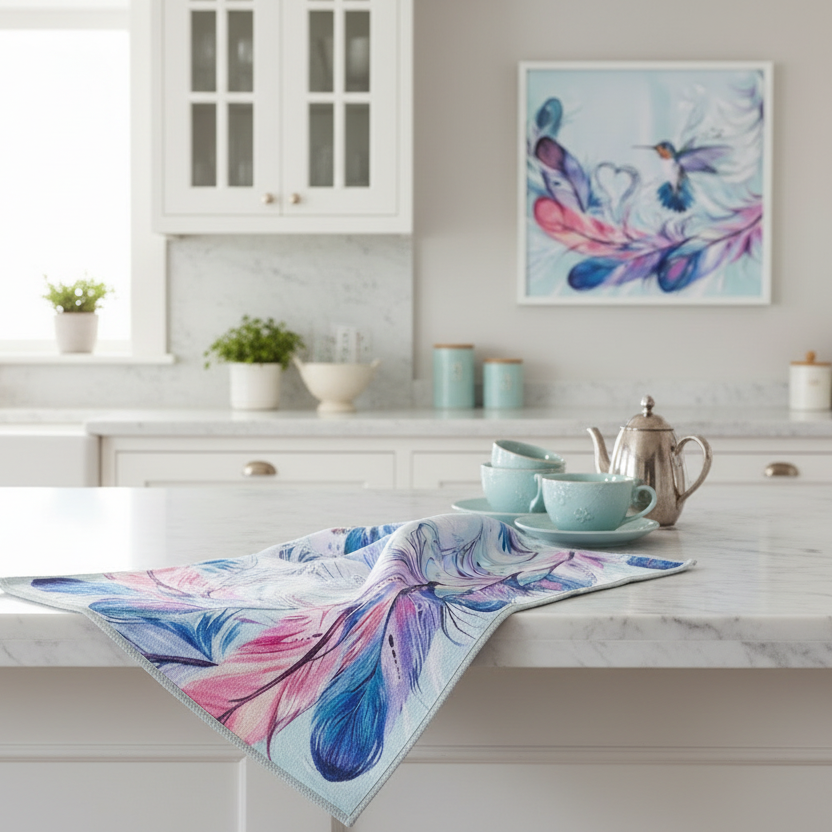 This tea towel represents a connection to Indigenous culture and the celebration of nature's beauty. Whether you're using it daily, displaying it as kitchen art, or giving it as a thoughtful gift, the Hummingbird Feathers Tea Towel brings grace, purpose, and cultural appreciation into your home.